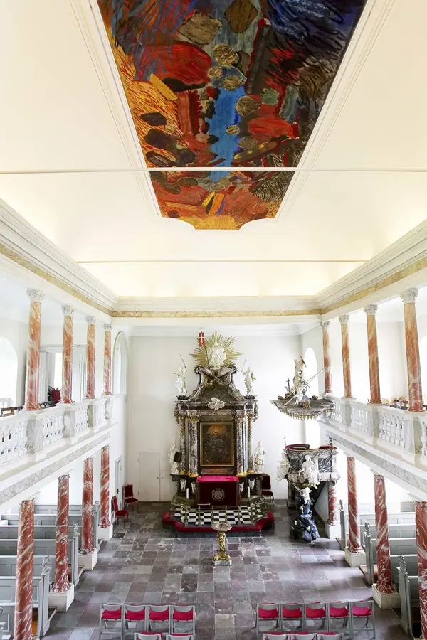 Slotskirkens alter er udført af billedhuggeren Friedrich Ehbisch, og altertavlens billede ”Dommedag” er malet af Henrik Krock. Altersølvet blev fremstillet til kirkens indvielse i 1726 og er desuden udsmykket med Frederik IV’s kronede spejlmonogram. I 2006 blev Slotskirkens loft udsmykket med et 8,5 x 3,5 meter loftsmaleri af kunstner Per Kirkeby.