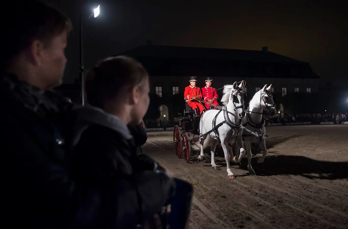 På det oplyste Ridebaneanlæg vil der kl. 19.00 være opvisning med heste og kareter fra De Kongelige Stalde og Gardehusarregimentets Hesteskadron.