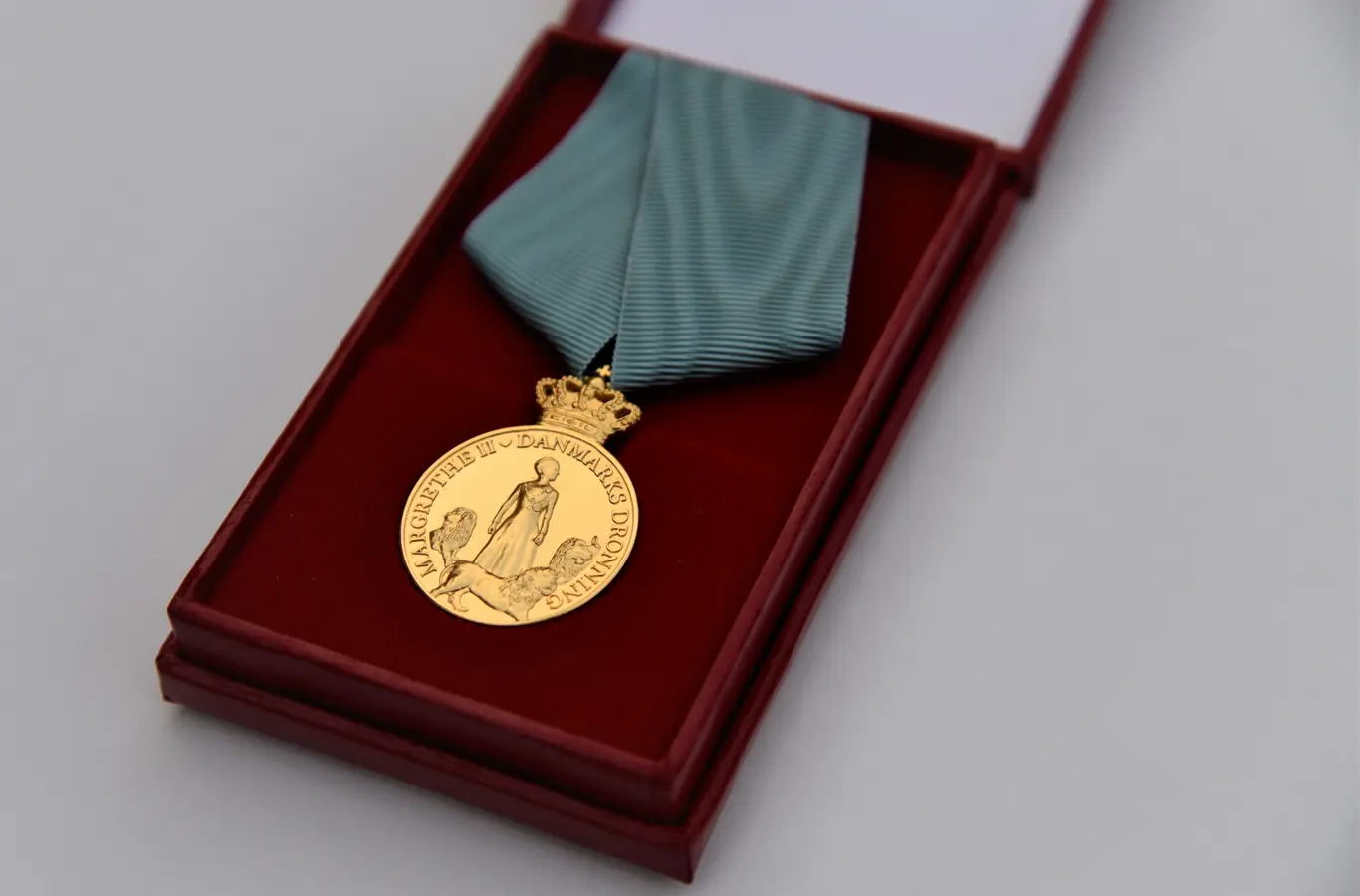 The medal, which is made of gilded silver and with a crown, is stamped on the front side with a full-length portrait of The Queen surrounded by the three silver lions from Rosenborg Palace and the inscription MARGRETHE II DENMARK’S QUEEN. The Queen wears the collars and breast stars of the Order of the Elephant and the Order of Dannebrog as well as Frederik IX’s portrait and the Order of Dannebrog’s Grand Commander Cross in the portrait and is flanked by the silver lions, which were made between 1665-70 at the request of Frederik III to stand before the throne. Since then, the lions have been used for ceremonial occasions in the Royal House of Denmark.
