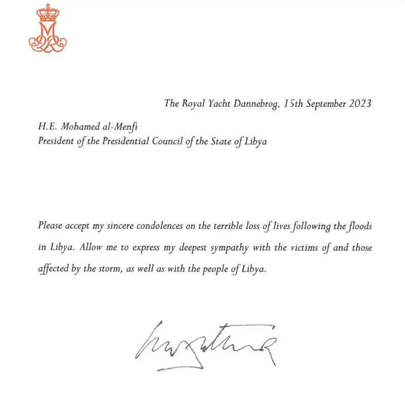 On 15 September 2023, HM The Queen has sent a letter of condolence to the Chairman of the Presidential Council of Libya, HE Mohamed al-Menfi, in connection with the massive floods that took place in eastern Libya a few days ago.