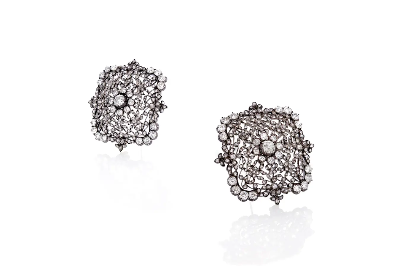 The two square brooches with diamonds, set in silver and gold, are so-called shoulder brooches, made to be used on the shoulders, but now worn freely, wherever it suits.