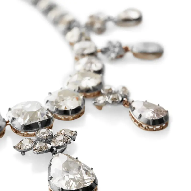 Several of the gems in the Brilliant-cut Diamond Set belonged to the jewels that Queen Sophie Magdalene bequeathed to the Danish Crown in 1746, among others the necklace’s middle pendant.