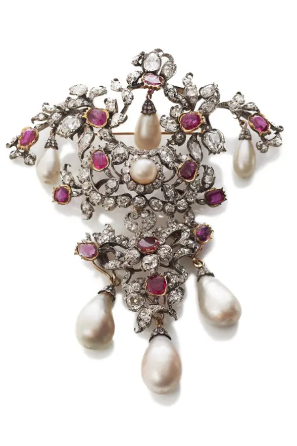 The Pearl-Ruby Set, decorated with pearls, rubies and diamonds, consists of a short pearl necklace as well as a brooch and earrings with dangling pearl ‘poires’.