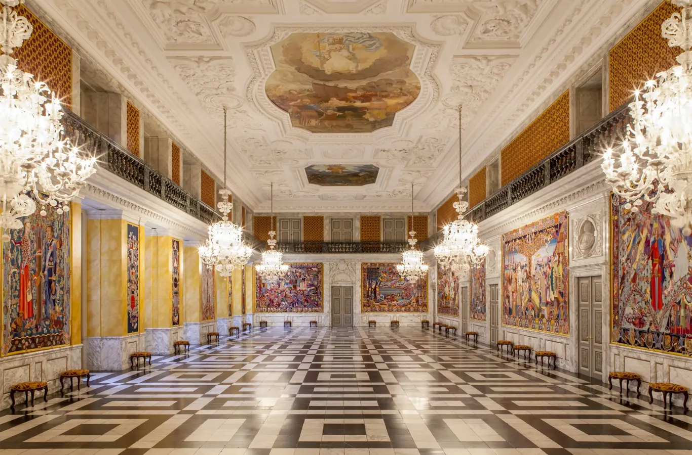 De Kongelige Repræsentationslokaler vil blive benyttet som ved et gallataffel på Christiansborg Slot, hvor både Dronningen og gæster ved ankomsten går gennem Drabantsale, ad Kongetrappen og til Fløjlsgemakket for at ende i Riddersalen. Ved et gallataffel er det i Riddersalen at middagen, underholdning og dans finder sted, men ved dette særlige arrangement er Riddersalen omdannet til et udstillingsrum for de 98 malerier, som Danmarks kommuner sammen med KL har givet Hendes Majestæt i 80-års fødselsdagsgave. Nedenfor kan man læse om nogle af de sale, der benyttes ved arrangementet.