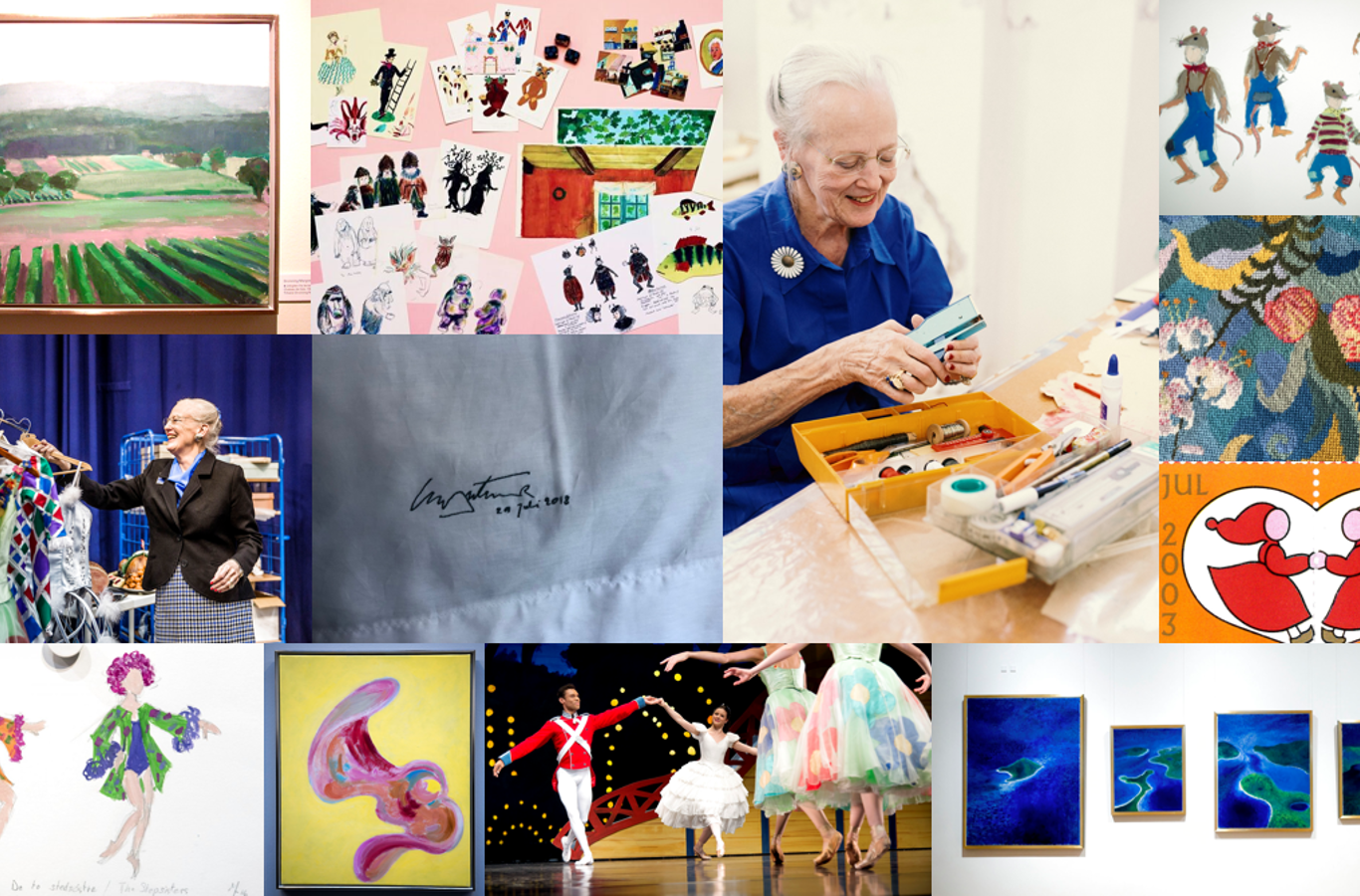 Siden begyndelsen af 1970’erne har Dronningen selv beskæftiget sig aktivt med en række kunstneriske udtryksformer; bogillustrationer, akvareller, maleri, découpager, scenografi, broderi, grafik og kirketekstiler. Inspireret af såvel den helt nære hverdag som af naturen, rejserne, litteraturen, arkæologien og fantasien, og med det velkendte ”M” som signatur har Dronningen gennem tiden prøvet flere kunstneriske medier og temaer af.