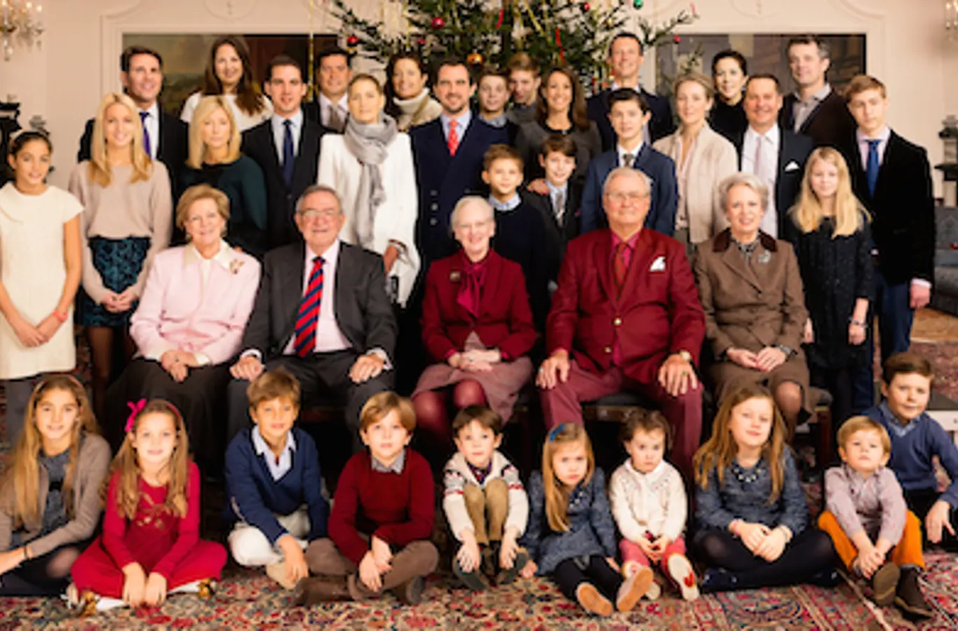 In connection with Christmas 2014, a photo of Her Majesty The Queen and His Royal Highness The Prince Consort and their family assembled by the Christmas tree in The Great Hall at Fredensborg Palace on Christmas Day has been released.