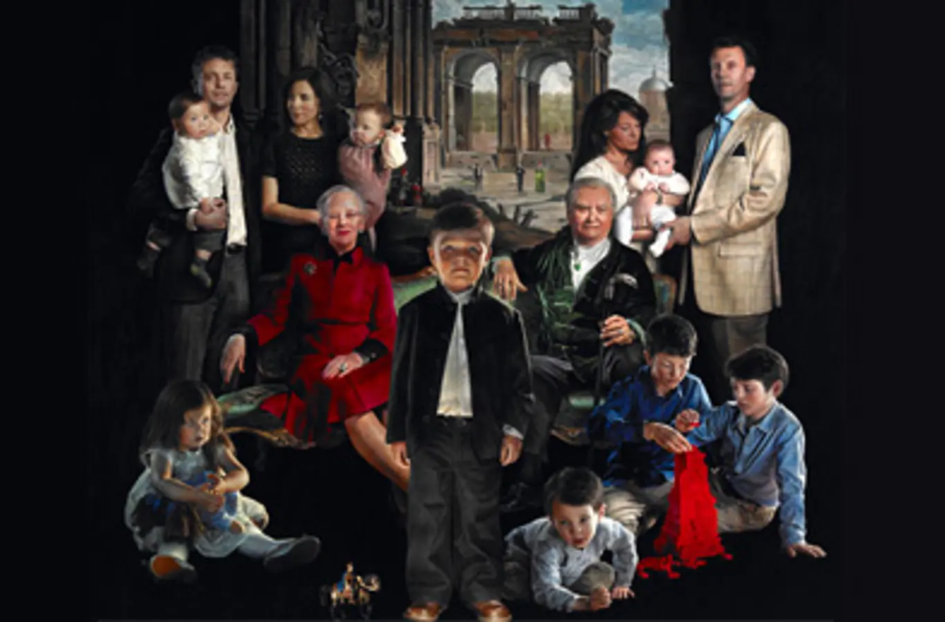 Thomas Kluge's portrait of the Royal Family with the title "Kongehuset" is the first royal family portrait in Denmark since Laurits Tuxen's "Fredensborgbillede", showing Christian 9. and Queen Louise with their family, from 1880s.