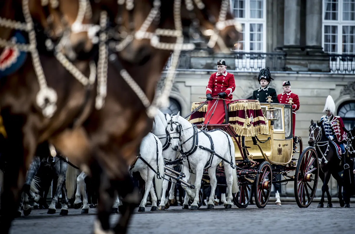 On Saturday, 10 September at 12:35, HM The Queen rides from Christian IX’s Palace at Amalienborg to Copenhagen City Hall in the Royal House of Denmark’s large d’Aumont carriage, which is ordinarily just called the Barouche. The route runs via Frederiksgade over Bredgade and right around the Marble Church. Afterwards, the Barouche continues along Store Kongensgade to Kongens Nytorv, where the Guard Hussar Regiment’s Mounted Squadron will escort The Queen in the open carriage down Strøget (the Pedestrian Zone) to City Hall Square and Copenhagen City Hall, with arrival at approximately 13:00.