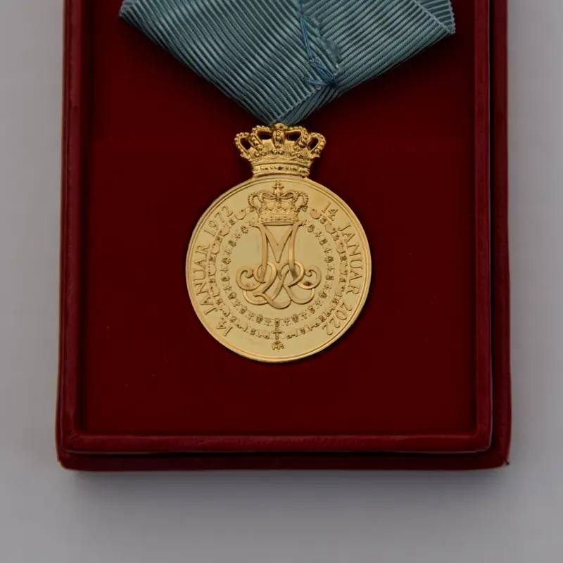 The back is stamped with The Queen’s crowned monogram surrounded by the collars of the Order of Dannebrog and the Order of the Elephant and with the inscription “14 JANUARY 1972” – “14 JANUARY 2022”. The monogram surrounded by the chains of the royal orders of chivalry is inspired by how Christian V, in a similar manner, surrounded his monogram with the chains of the royal orders of chivalry. The medal is produced by Georg Jensen A/S from an idea and a model by royal armorist Ronny Andersen.