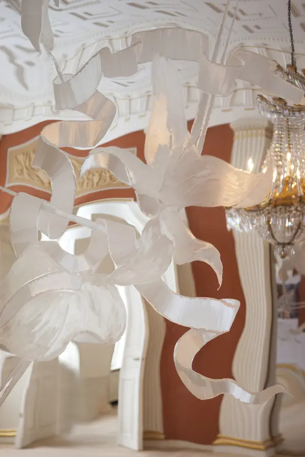 The banquet hall runs across the palace, and the walls are graced with five mirror-polished steel plates. The plates are four meters high and are engraved with bouquets of flowers. The engravings were made with a drill, which is one of Erik A. Frandsen’s special techniques.
