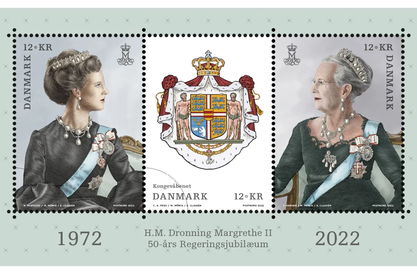 The new stamps, which are issued on the occasion of the jubilee of Her Majesty’s reign in 2022, show The Queen today and as the newly proclaimed sovereign in 1972. Between the two pictures, the Royal Coat of Arms is shown as the symbol of the Kingdom of Denmark.