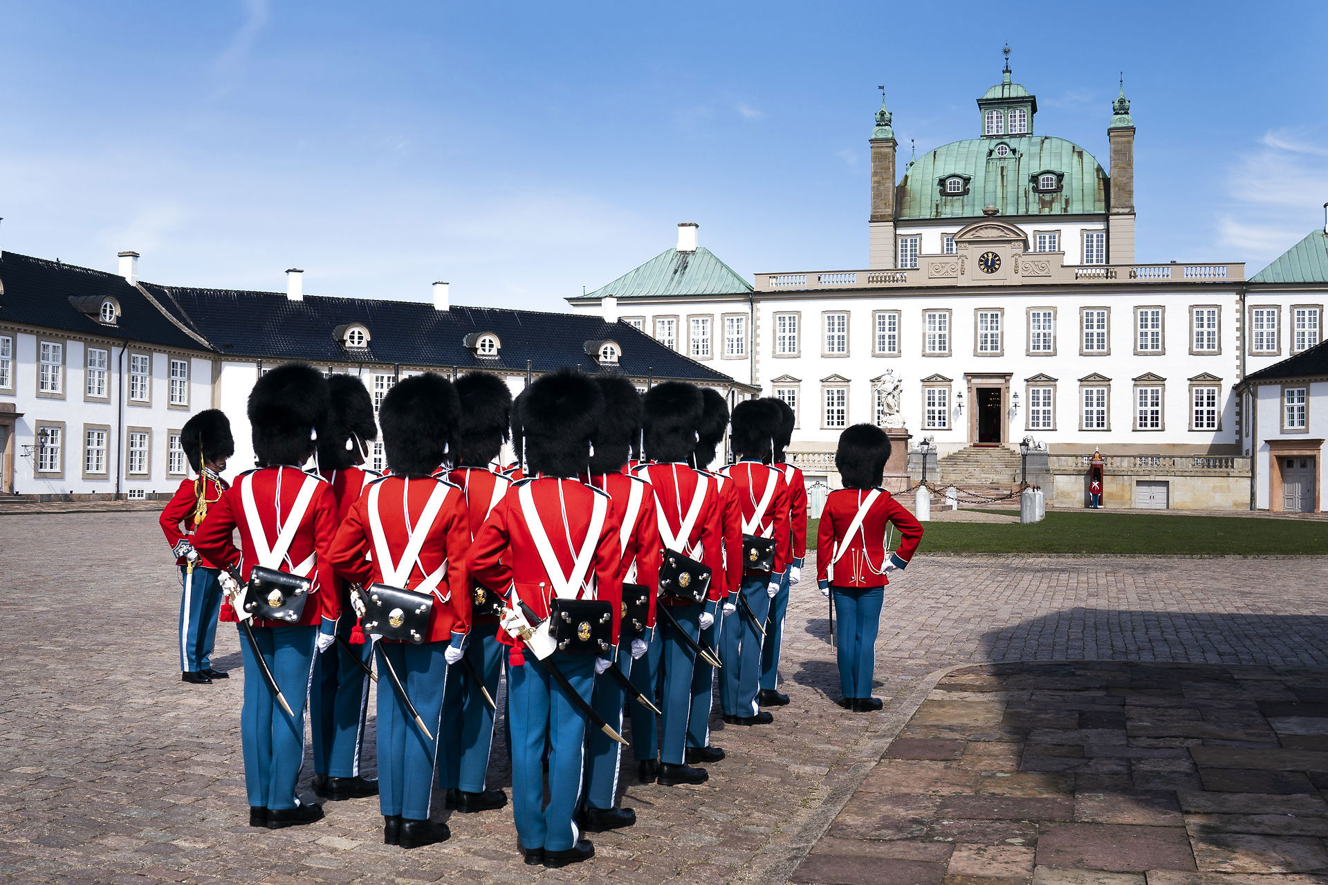 At Fredensborg Palace, the guard is established when The Royal Family resides at the palace at the Chancellery House.