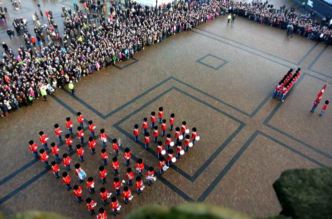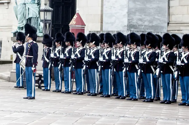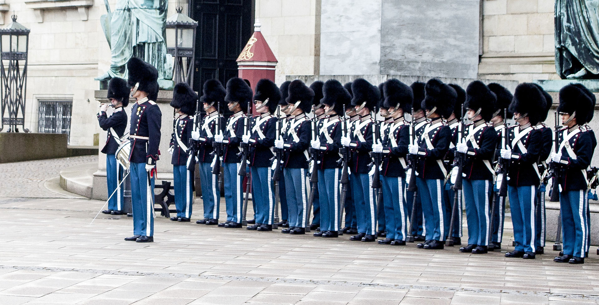 During the King’s Guard, there is a daily parade from the Life Guard’s Barracks on Gothersgade, Copenhagen, at 11:27. The march towards Amalienborg passes, among other things, the Round Tower and Kongens Nytorv.
