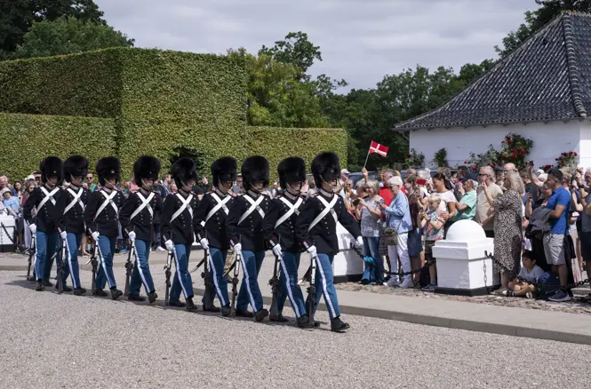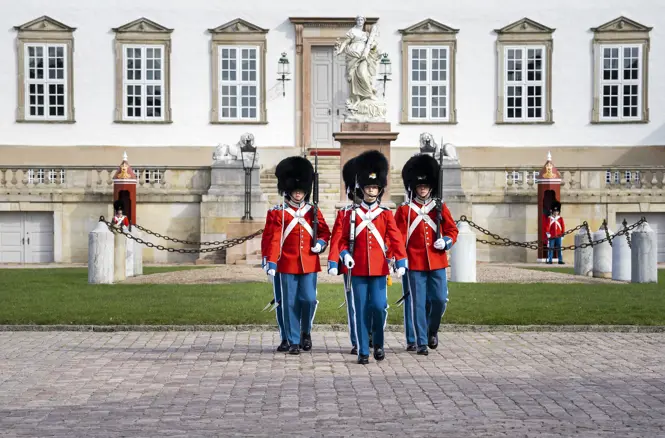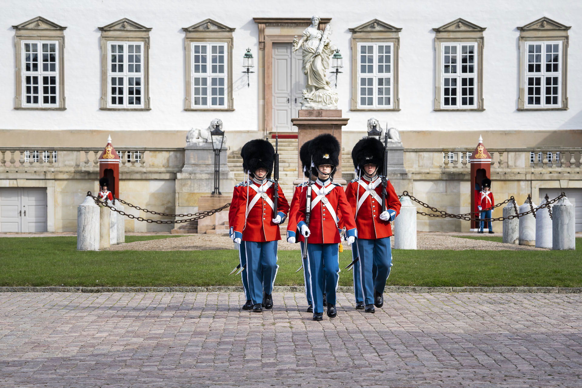 The changing of the guard takes place daily at 12:00 on the square in front of the guardhouse. The march from the Guard Barracks begins at 11:50 and goes along Skovridervej – Carl Nielsens Vej to the main entrance to the palace.