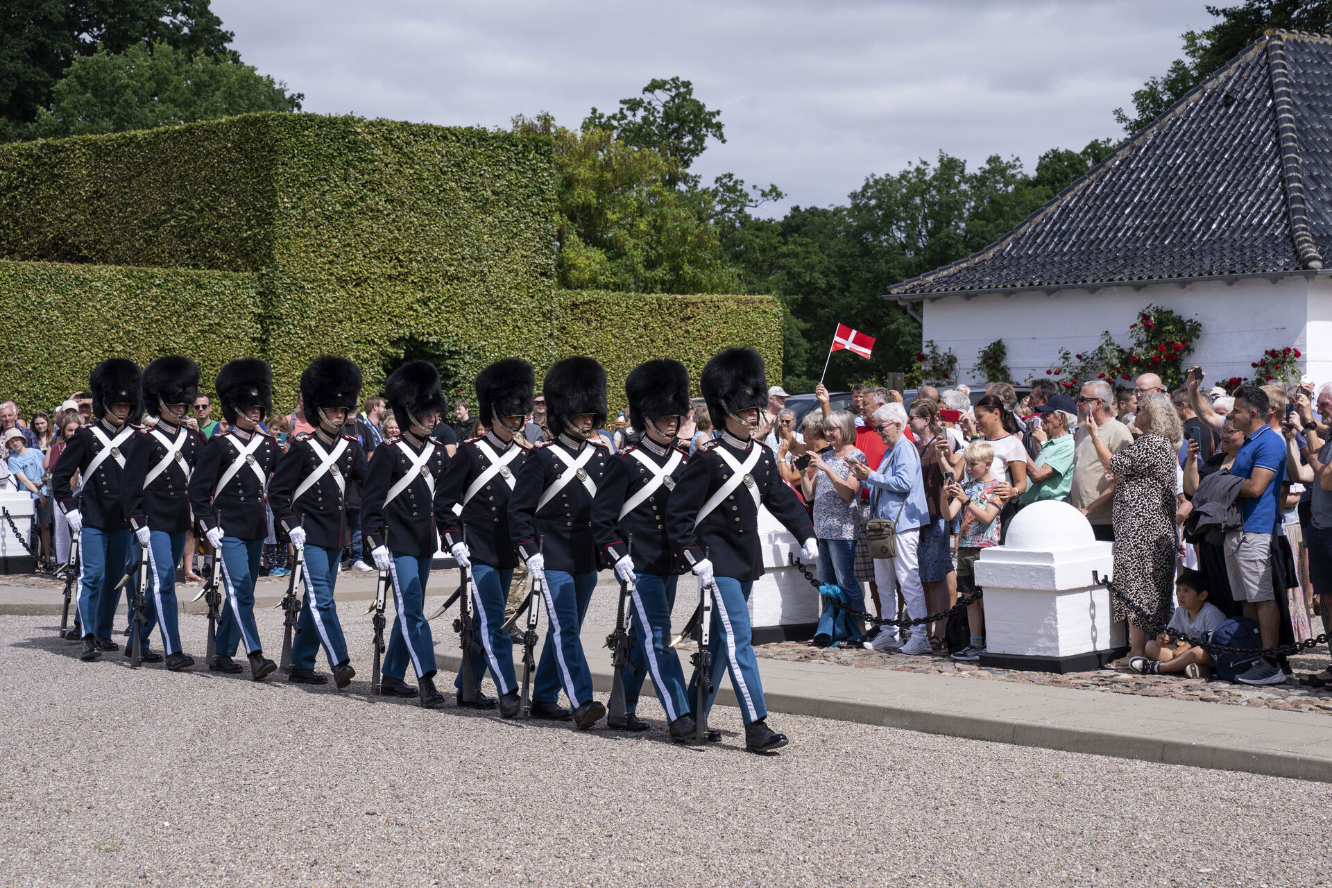 The changing of the guard takes place daily at 12:00 on the square in front of the guardhouse. The march sets out from “The Palace in Gråsten” at 11:43 along Ahlefeldtsvej – Borggade – Slotsgade – Slotsbakken and Felstedvej.