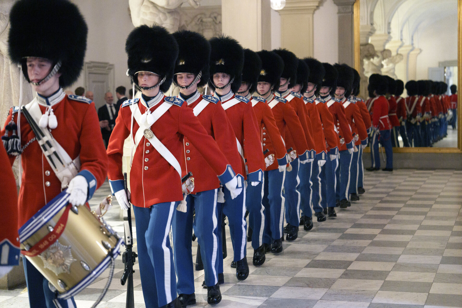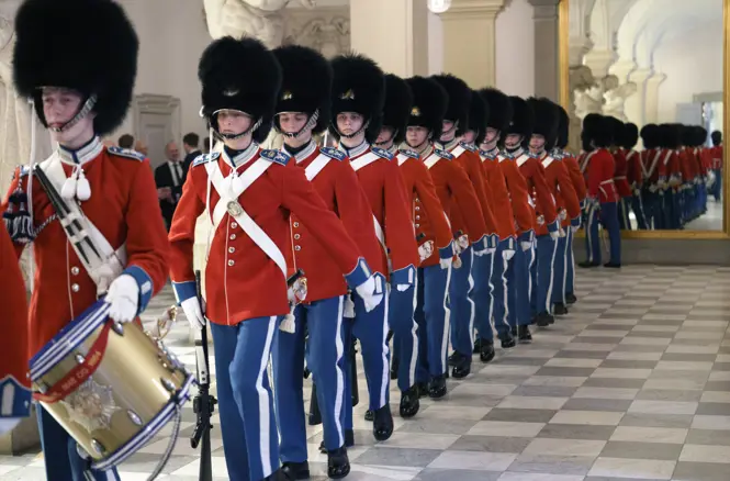 At Christiansborg Palace, the guard is established when The King holds arrangements at the palace.