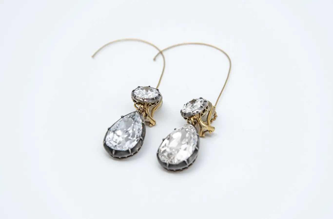 These earrings from the 1700s have one large diamond and, beneath, a pendant, a ‘pendeloque’, with a pear-shaped diamond. Like the ‘Rivière’ necklace, they belonged to Princess Anne of Orange, born in 1709 as a princess of England, but married to William of Orange.