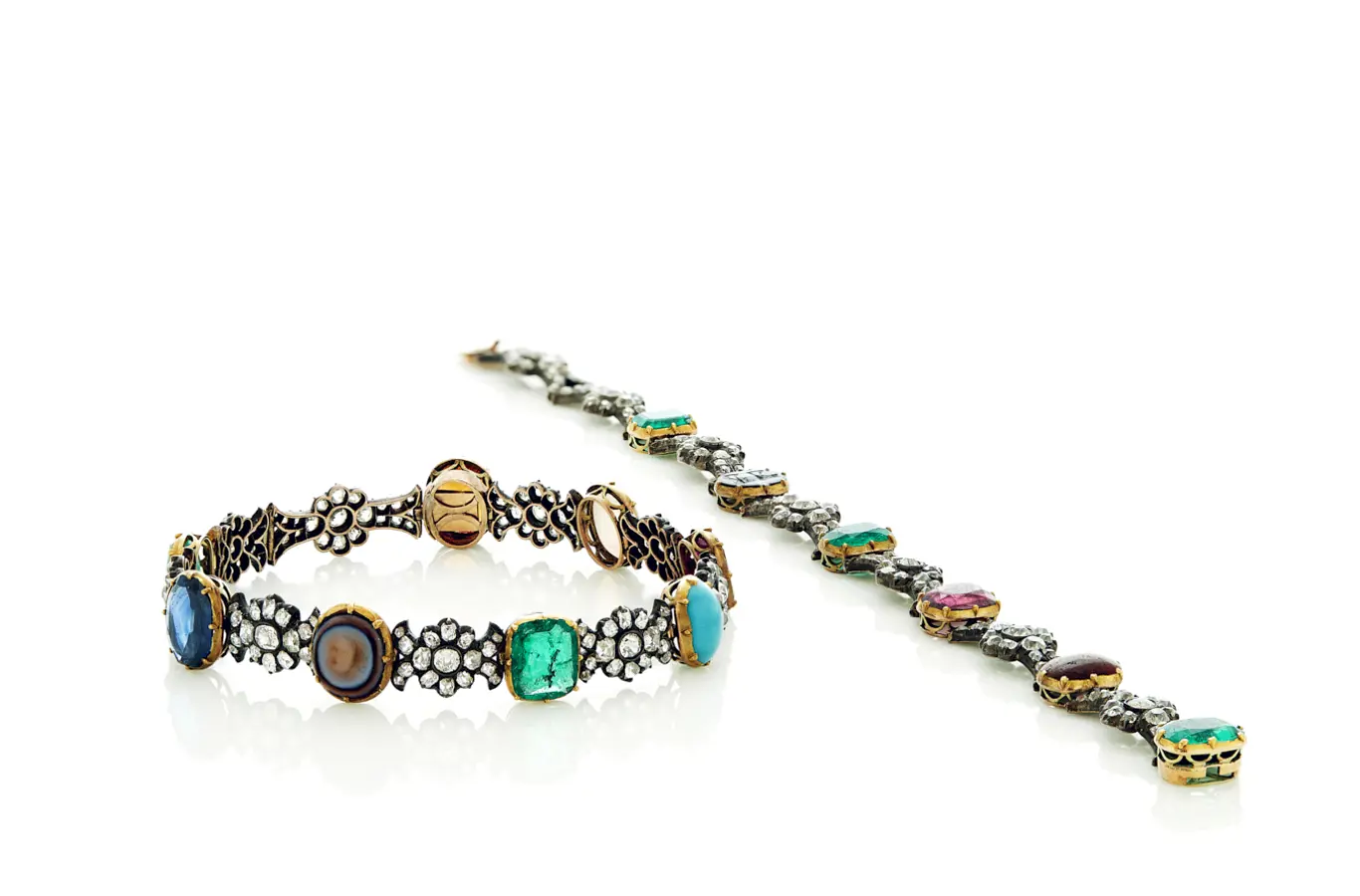 The two bracelets with coloured gemstones and diamond rosettes belonged to Empress Josephine, who was married to Emperor Napoleon. The couple had no children together, but when Napoleon, in 1806, adopted his wife’s two children from her first marriage, Eugène and Hortense, he presented the pair of bracelets to Josephine as a keepsake.