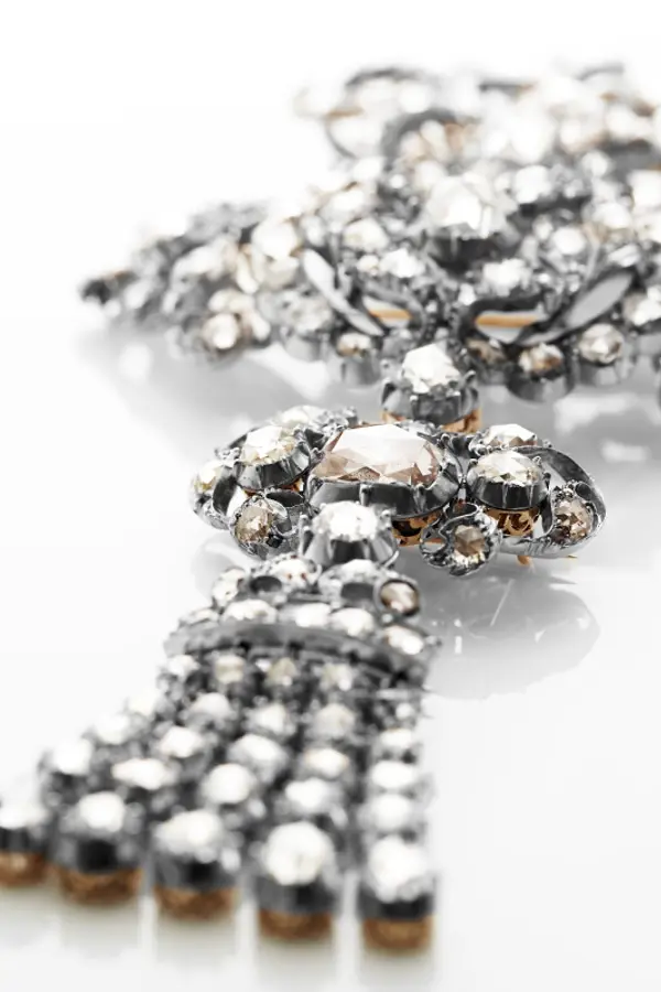 The Rose-cut Diamond Set consists of a diamond belt as well as a large brooch – called a ‘corsage’ or breast ornament. The belt was intended to be sewn on the front of the dress as decoration with the large brooch, which can be divided into several smaller ones, at the top on the breast.