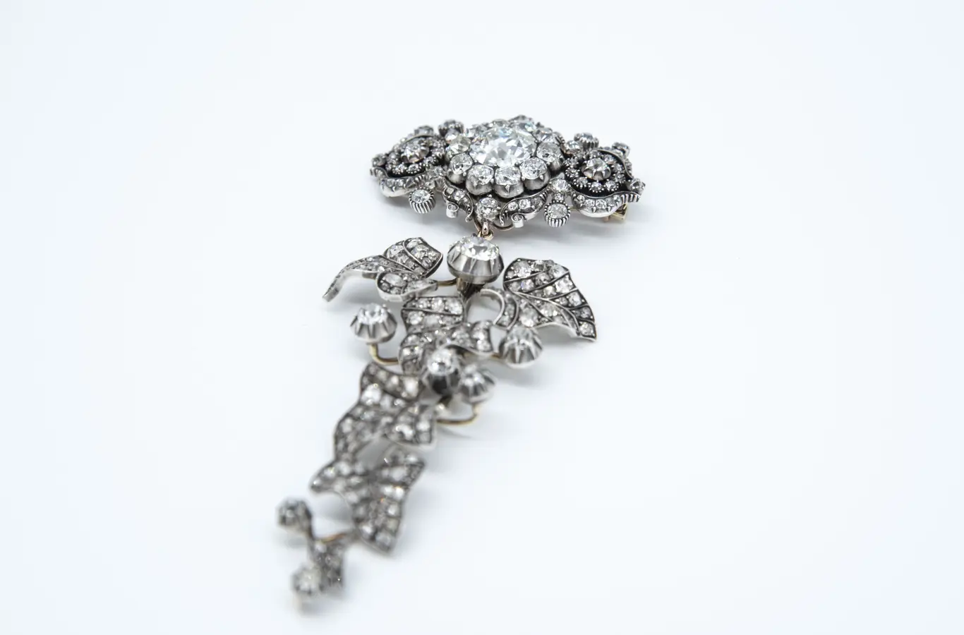 Den store broche består af en liggende oval med en roset og heri en stor diamant kranset af ti mindre diamanter samt diamantbesatte snirkler. Fra ovalen hænger et langt, aftageligt vedhæng, formet som en efeugren med syv store diamanter i gamle sølvafdækninger og derimellem seks efeublade besat med diamanter.