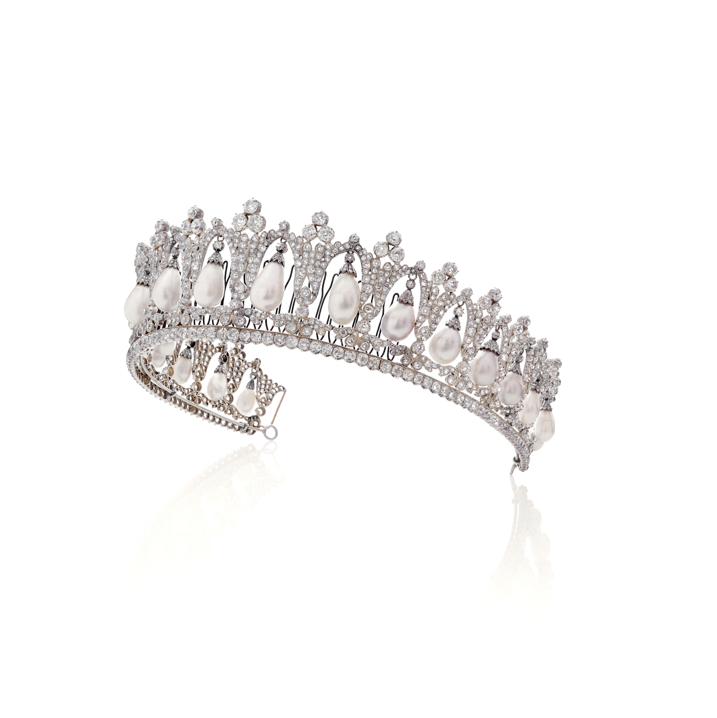 Diademet er udført i hvidguld og opbygget som en række stiliserede, diamantbesatte lotusblomster, der sammen danner åbne, let tilspidsede buer i svagt stigende højde ind mod diademets midte. Fra hver af buerne hænger en stor pæreformet perle, deraf betegnelsen perle-’poires’, der dingler ved bevægelse. Både den halvcirkulære, bøjleformede base og diademets buer er tæt besat med ’old cut’ diamanter på en reflekterende, sølvfolieret bund.