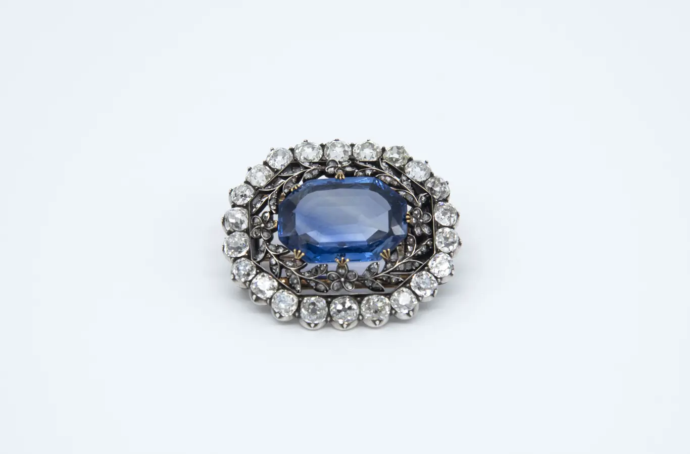 Brochen, kaldet vandflodssafiren, har en stor ottekantet, smaragdslebet safir omgivet af en blomsterkrans af små diamanter og yderst en krans af 22 store diamanter.