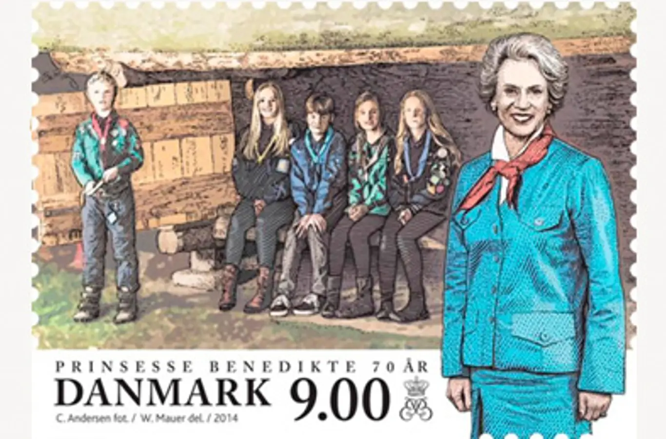 Frimærket sælges til fordel for de danske spejderorganisationer og viser Prinsesse Benedikte sammen med unge spejdere.
