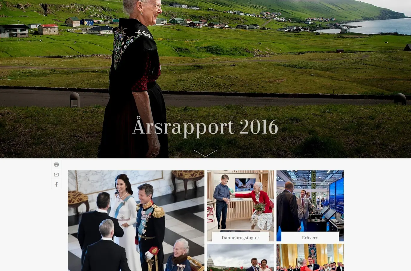 Som noget nyt i årsrapporten 2016 er der mulighed for at dykke ned i den kongelige families gøremål gennem syv temaartikler, der blandt andet omhandler H.M. Dronningens arbejde med at udforme et antependium til Wittenberg samt H.K.H. Kronprinsens fokus på at forbinde danske iværksættere og erhvervslivet.