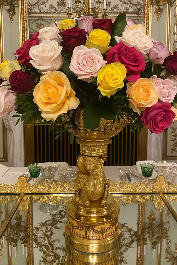 Blomsterdekorationerne til nytårstaflet den 1. januar 2024 er sat op som et farvestrålende festfyrværkeri af roser i alverdens farver og nuancer. H.M. Dronningen har været med til at vælge farvekombinationen og udvælge blomsterne, der blandt andet består af letudsprugne roser i pink, rød, gul, creme, laksefarve, lyserød og lilla.