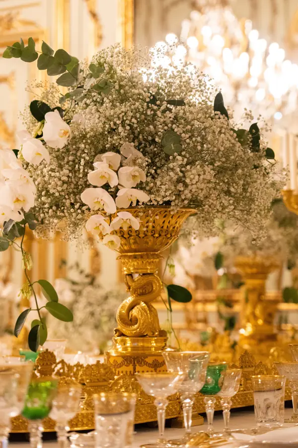 Blomsterdekorationerne til nytårstaflet den 1. januar 2025 er holdt i et enkelt og elegant hvidt nytårstema. H.M. Dronningen har været med til at udvælge blomsterne, der blandt andet består af store skyer af hvide, småblomstrede gypsophila, hvide orkideer, storbladede eucalyptus og jasminranker fra Fredensborg Slot.