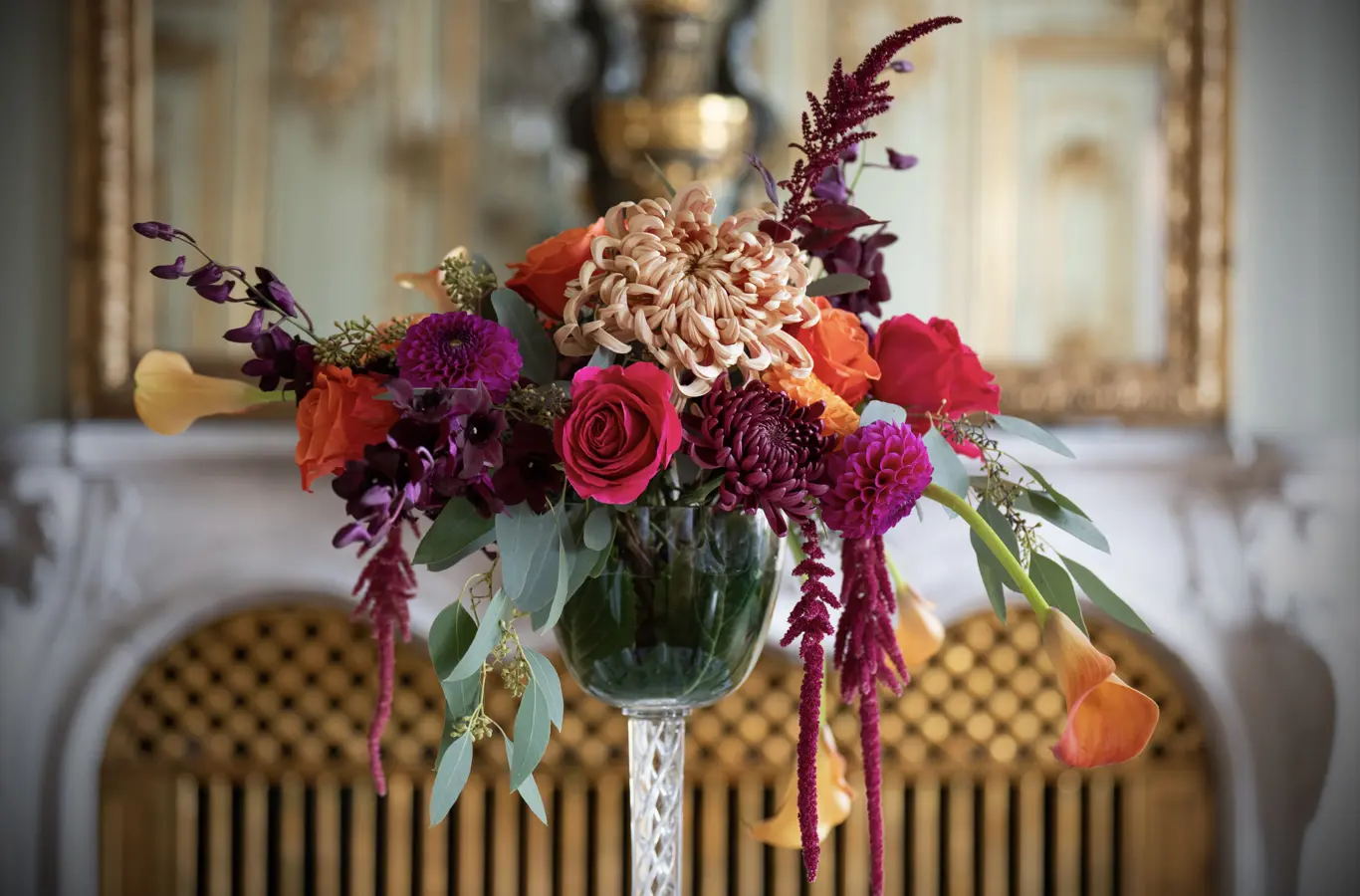 Riddersalen i Christian VII’s Palæ prydes af blomster i varme efterårsfarver. Dekorationerne kombinerer kraftig pink og lysende orange i smuk harmoni med rummets gyldne detaljer. Derudover skaber georginer og roser i pink og orange, lysende calla, hortensia og krysantemum samt lilla orkidéer og eukalyptus i rødlige toner tilsammen dybde og variation i dekorationerne. Som et særligt indslag indgår amaranth, dyrket og høstet i Fredensborg Slotshave, som giver dekorationerne et unikt præg og bringer et strejf af Kongefamiliens egne haver ind i rummet.