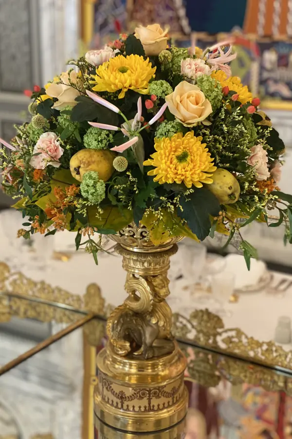 Med inspiration fra efterårsskovens farver er blomsterdekorationerne i Frederik den 6.’s dessertstel holdt i lyse, grønne, gule, orange og laksefarvede nuancer. På bordene til gallataflet pryder blade fra tulipantræet og kvæder fra Fredensborg Slot sammen med laksefarvede nelliker, smukke lysende neriner og småblomstrede staticer. Gule trommestikker har selskab af asclepias tuberose -også kaldet orange silkeplante - lyse viburnum, hypericum og storhovedet ferskenfarvede avalanche roser.