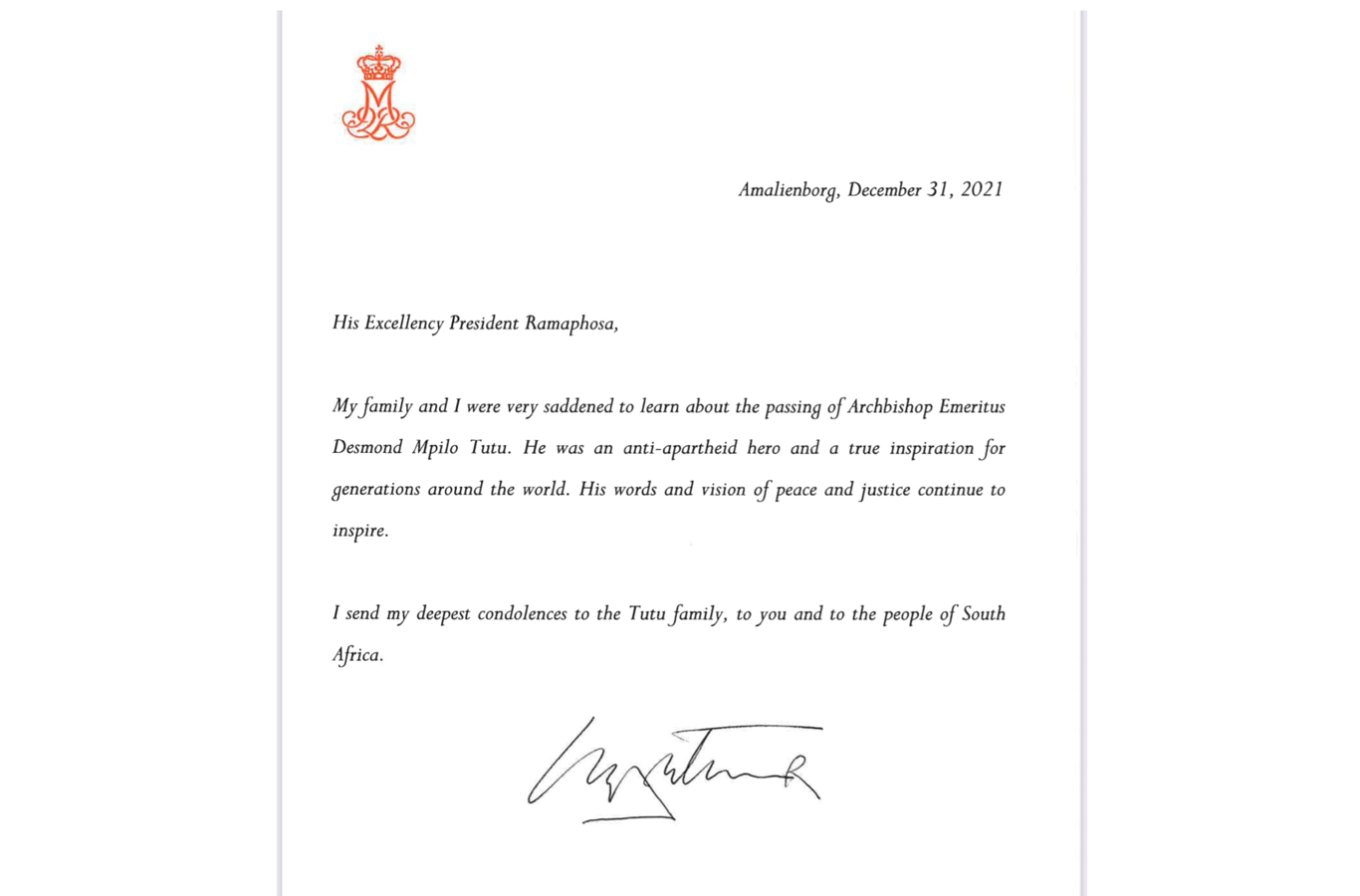 H.M. Dronningen har i går sendt følgende kondolence til H.E. Republikken Sydafrikas Præsident Cyril Ramaphosa i anledning af den sydafrikanske ærkebiskop og menneskerettighedsforkæmper Desmond Tutus død.