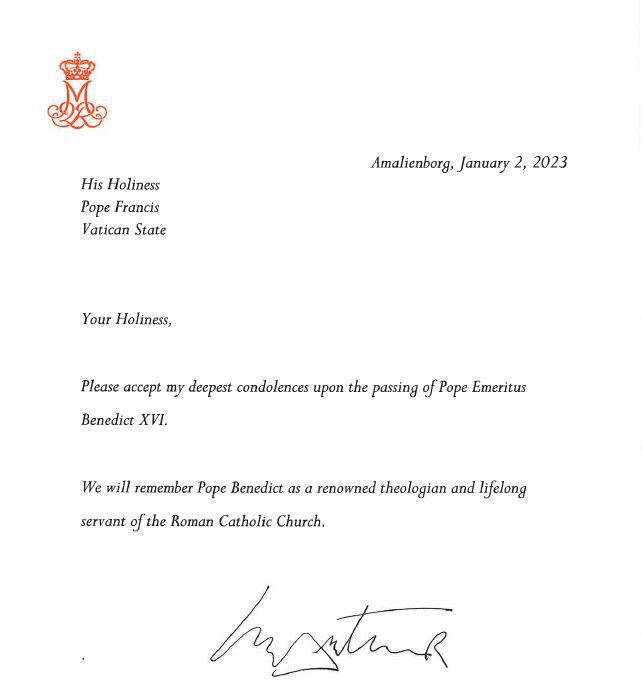 2. januar 2023 | Nyhed H.M. Dronningen sender kondolenceskrivelse til Hans Hellighed Pave Frans i anledning af Pave Emeritus Benedict XVI’s død Del