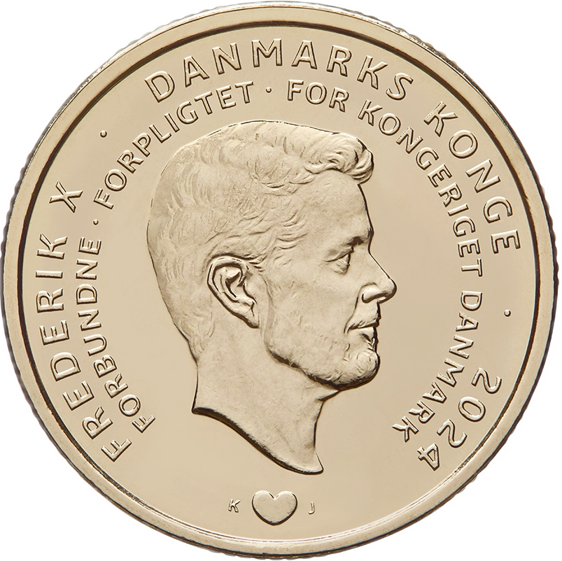 På møntens forside ses et portræt af H.M. Kongen i profil, vendt mod højre. Langs den yderste rand står indskriften: "FREDERIK X, DANMARKS KONGE, 2024". I den inderste ring står Hans Majestæts valgsprog: "FORBUNDNE, FORPLIGTET, FOR KONGERIGET DANMARK".