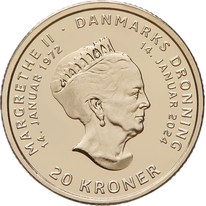 På møntens bagside findes et portræt af Dronning Margrethe, også i profil og vendt mod højre. Langs randen står indskriften: "MARGRETHE II, DANMARKS DRONNING". I den inderste ring er Dronning Margrethes regeringsperiode angivet: "14. JANUAR 1972 – 14. JANUAR 2024".