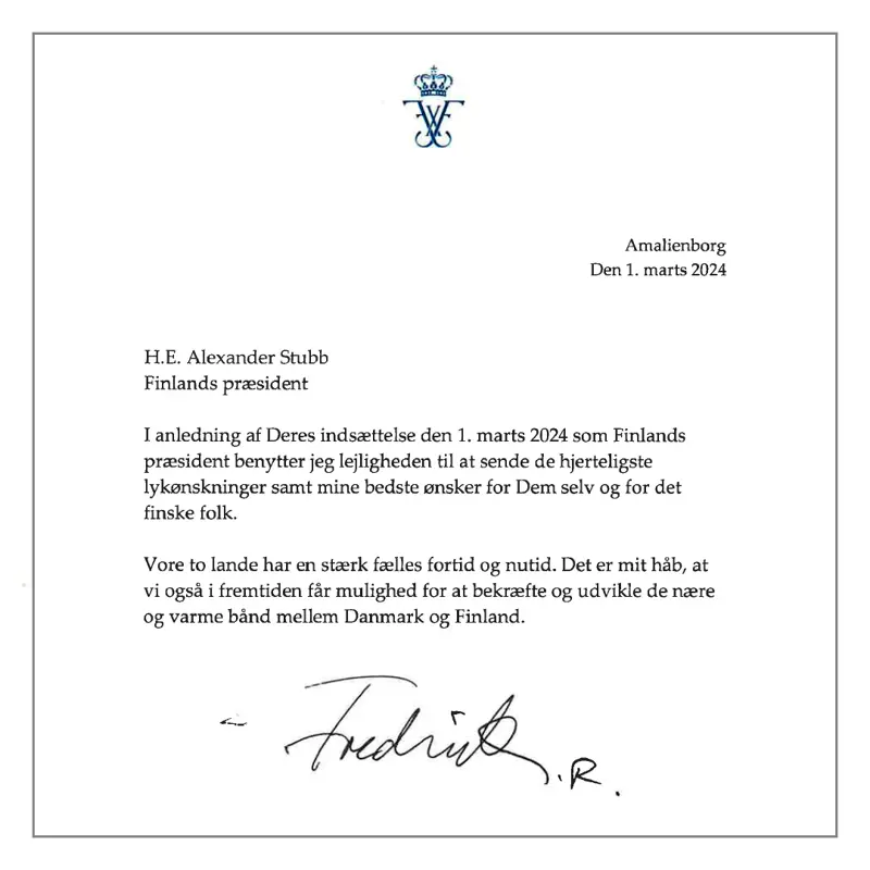 I anledning af Deres indsættelse den 1. marts 2024 som Finlands præsident benytter jeg lejligheden til at sende de hjerteligste lykønskninger samt mine bedste ønsker for Dem selv og for det finske folk.