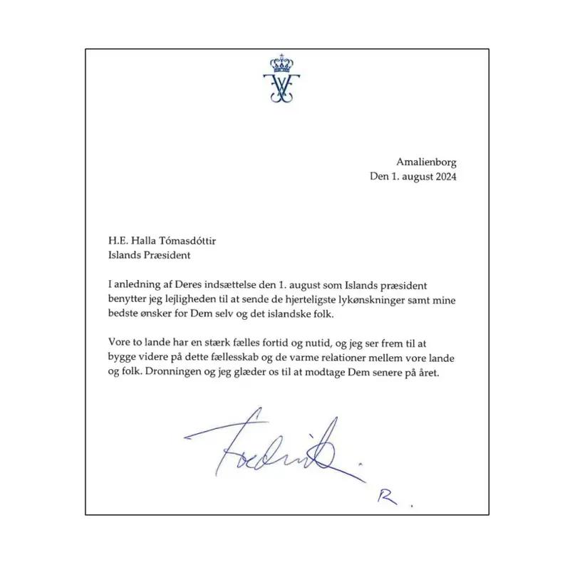 I anledning af Deres indsættelse den 1. august som Islands præsident benytter jeg lejligheden til at sende de hjerteligste lykønskninger samt mine bedste ønsker for Dem selv og det islandske folk.