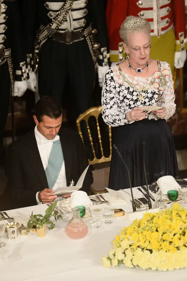 Det er med meget stor glæde, at Prins Henrik og jeg i dag byder Mexicos Præsident og fru Rivera velkommen til Danmark, et besøg, som understreger de gode relationer mellem vore to lande, så meget mere som det er det første mexicanske statsbesøg i Danmark.