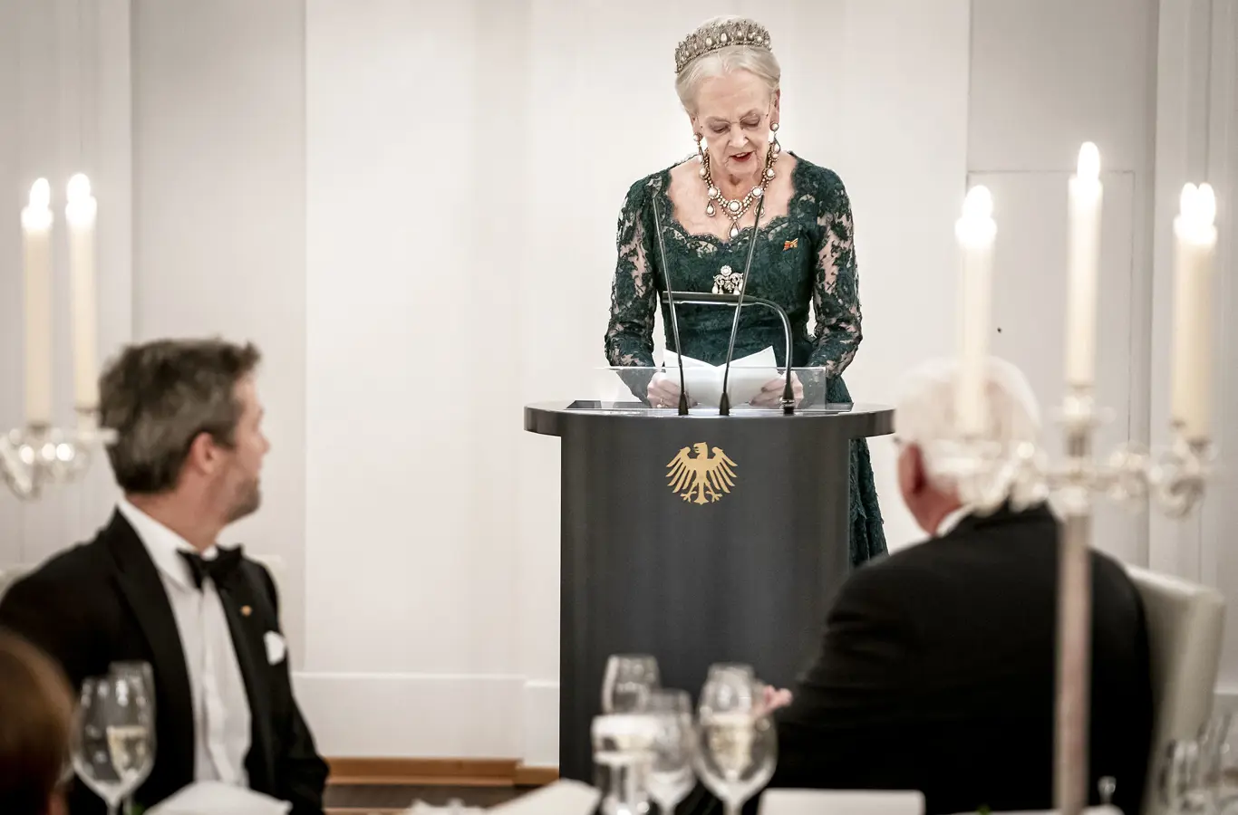 Med dette ønske hæver jeg mit glas og udbringer en skål for Tysklands præsident og Fru Elke Büdenbender.