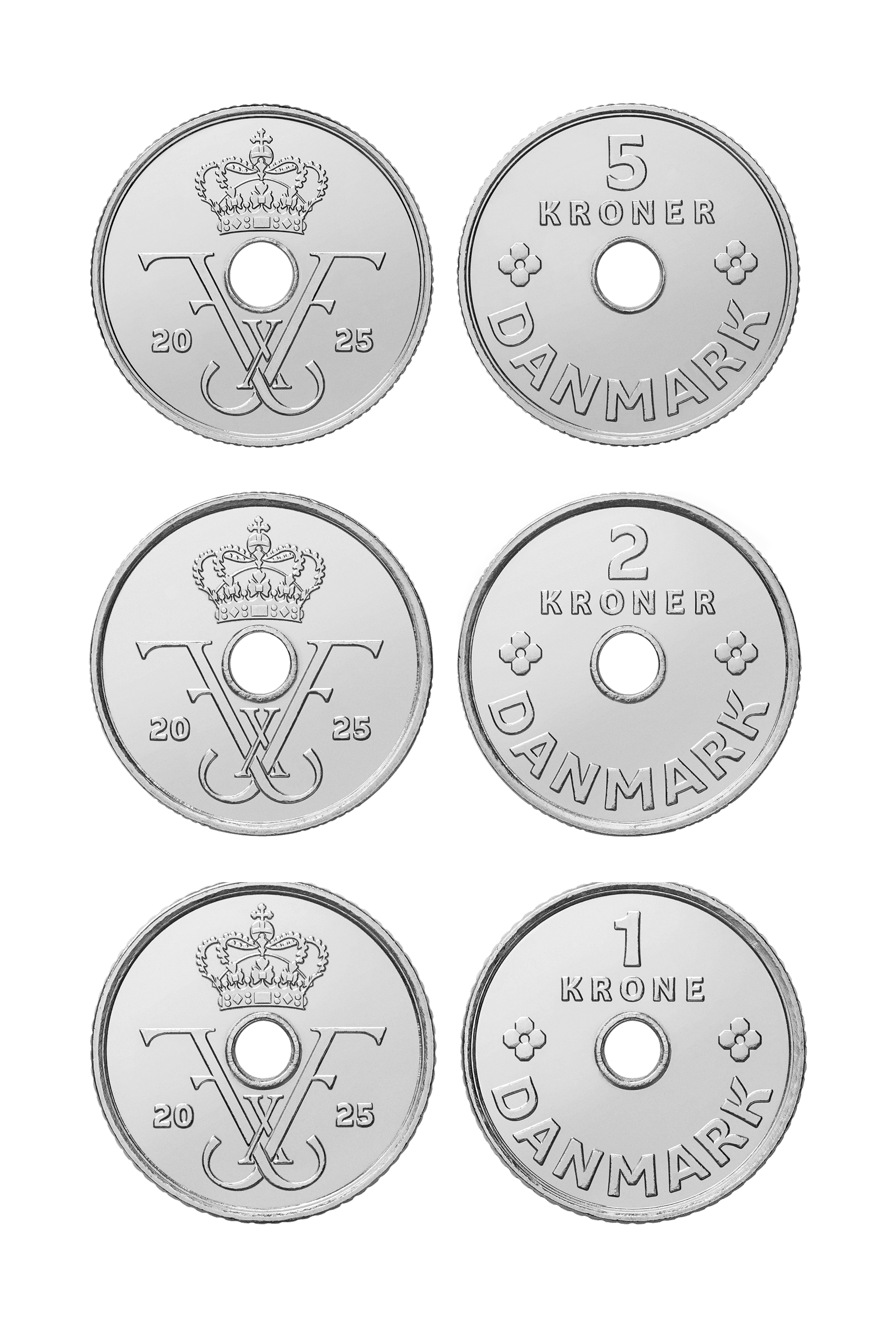 De mindre mønters forside, 1-, 2- og 5-kronemønterne, bærer Kongens monogram sammen med årstallet for produktionen. Bagsiden viser møntens værdi og teksten “Danmark”, og prydes af et nyt grafisk element: fire forbundne ottekanter, inspireret af Amalienborg Slotsplads.