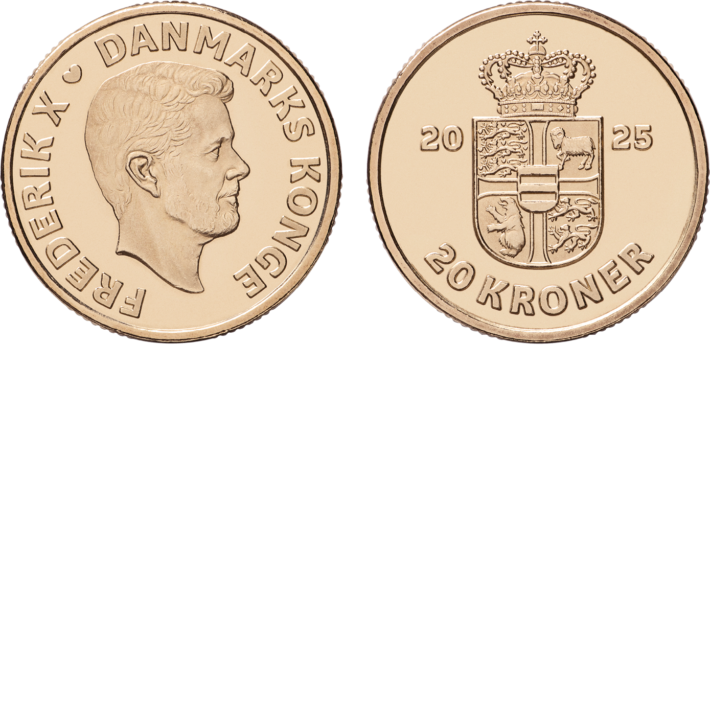 20- og 10-kronemønterne følger skikken med at bære portrættet af den siddende regent. På 20-kronemøntens forside ses et portræt af Kongen i profil, vendt mod højre. Langs den yderste rand står indskriften “Frederik X – Danmarks Konge”. 20-kronemøntens bagside prydes af kongevåbenet, mens 10-kronemønten gengiver motivet i en lidt mindre udgave.