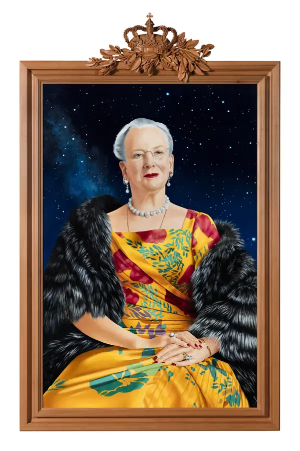 Kunstneren har valgt at skabe et portræt af Dronningen af privat karakter under åben stjernehimmel og uden kongelige artefakter, men rammen i pæretræ er prydet af den kongekrone, som blandt andet findes i rigsvåbenet.