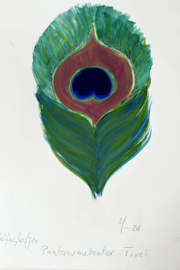 Foto er en skitse til detalje på det nye påfuglefortæppe tegnet af Dronning Margrethe i 2024.