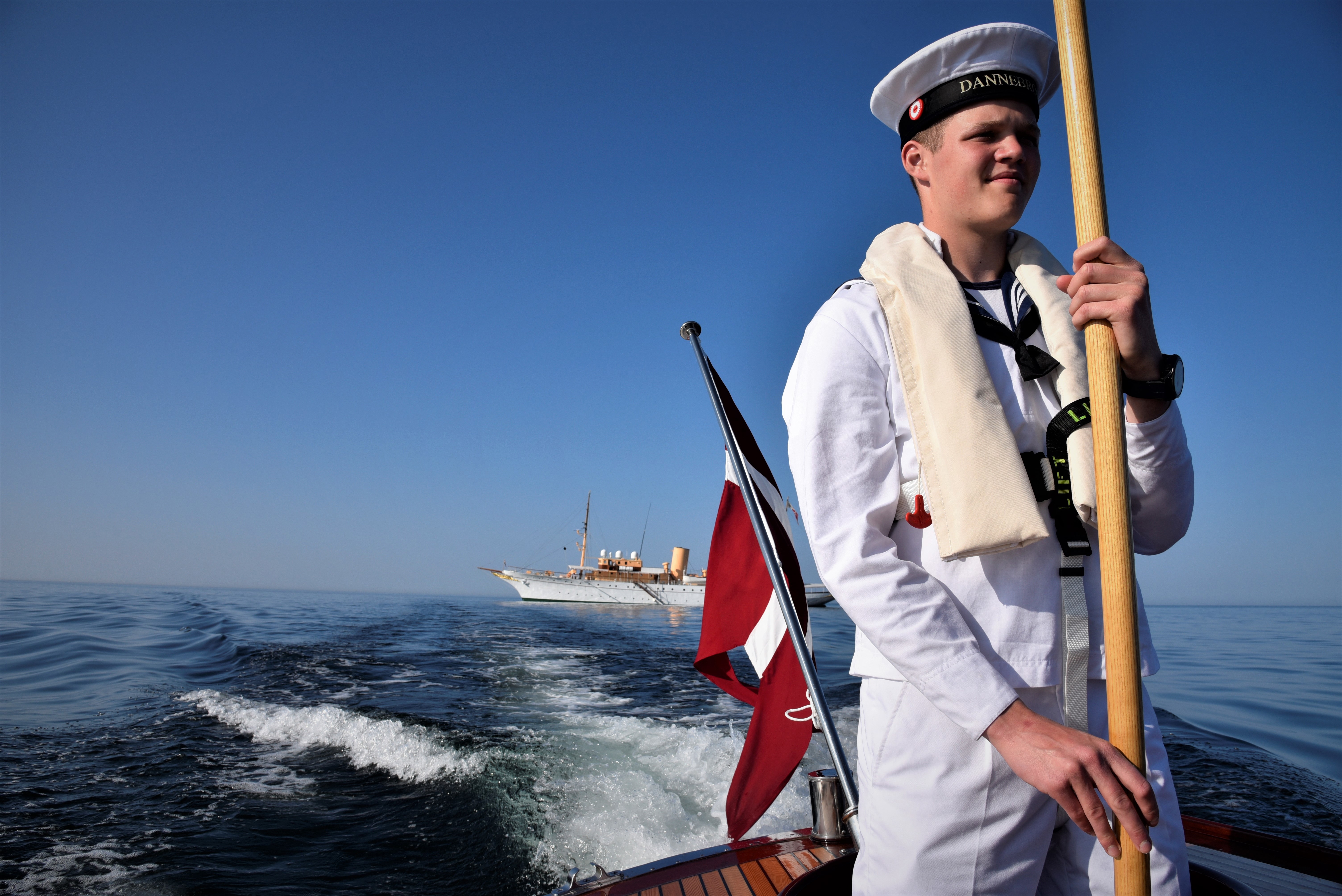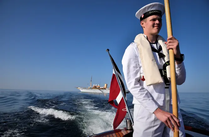 Dronningen er vært ved en reception for indbudte gæster på Kongeskibet Dannebrog i Vordingborg Havn.