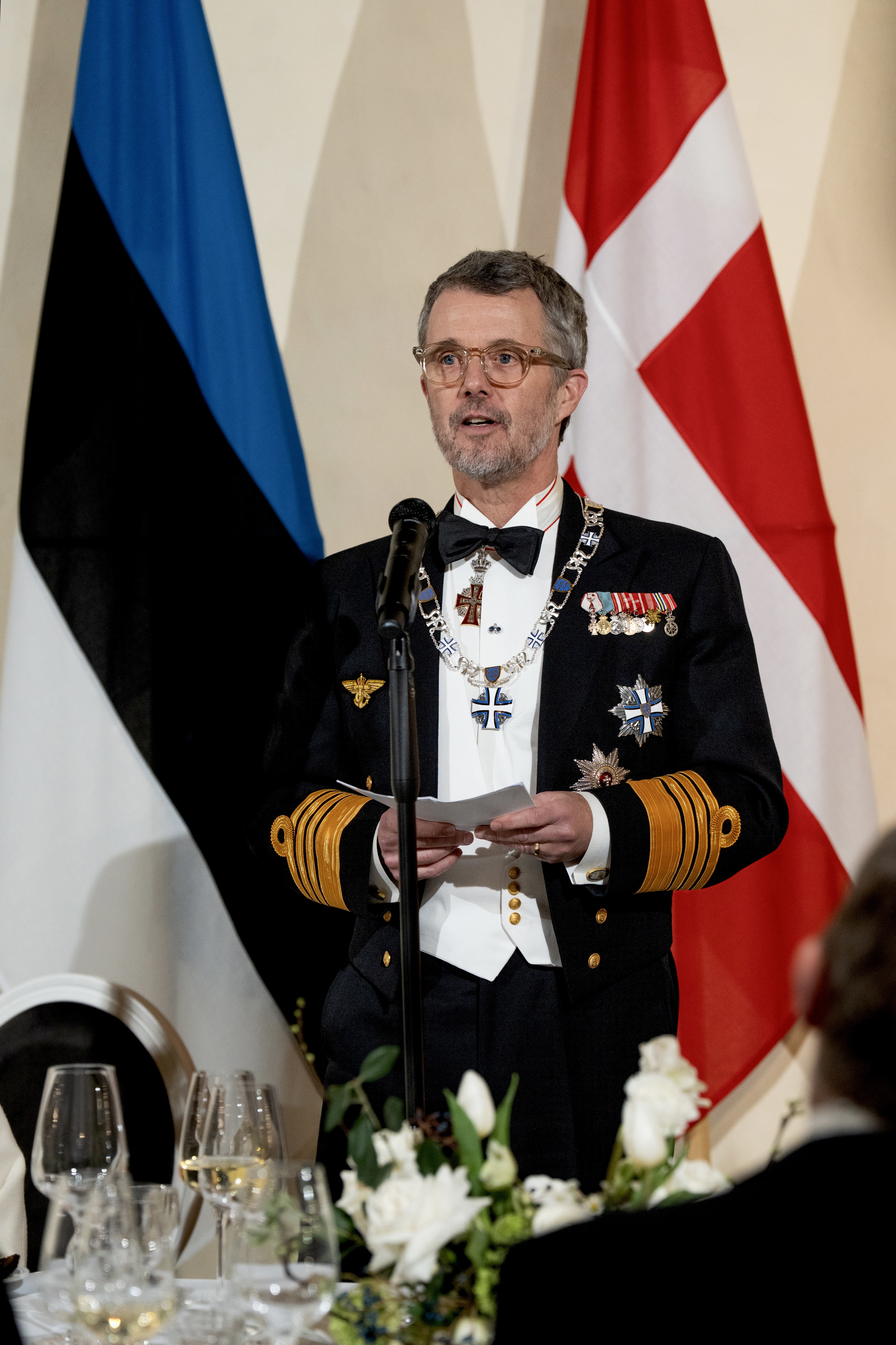 Jeg vil på Dronning Marys og mine vegne takke Dem for den varme velkomst – Tallinn har i den grad levet op til sit navn. Jeg udbringer en skål for Dem, fru Sirje Karis og for det estiske folk med ønsket om venskab samt lykke og fremgang for begge vores lande.